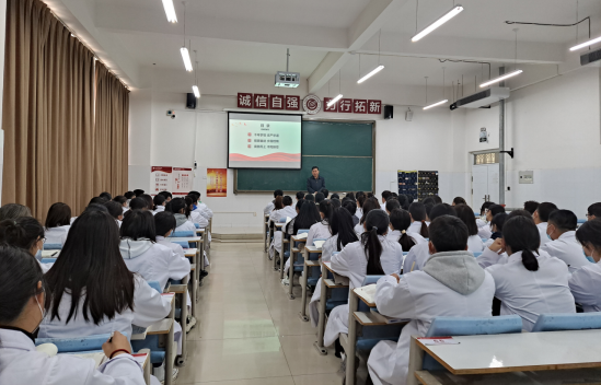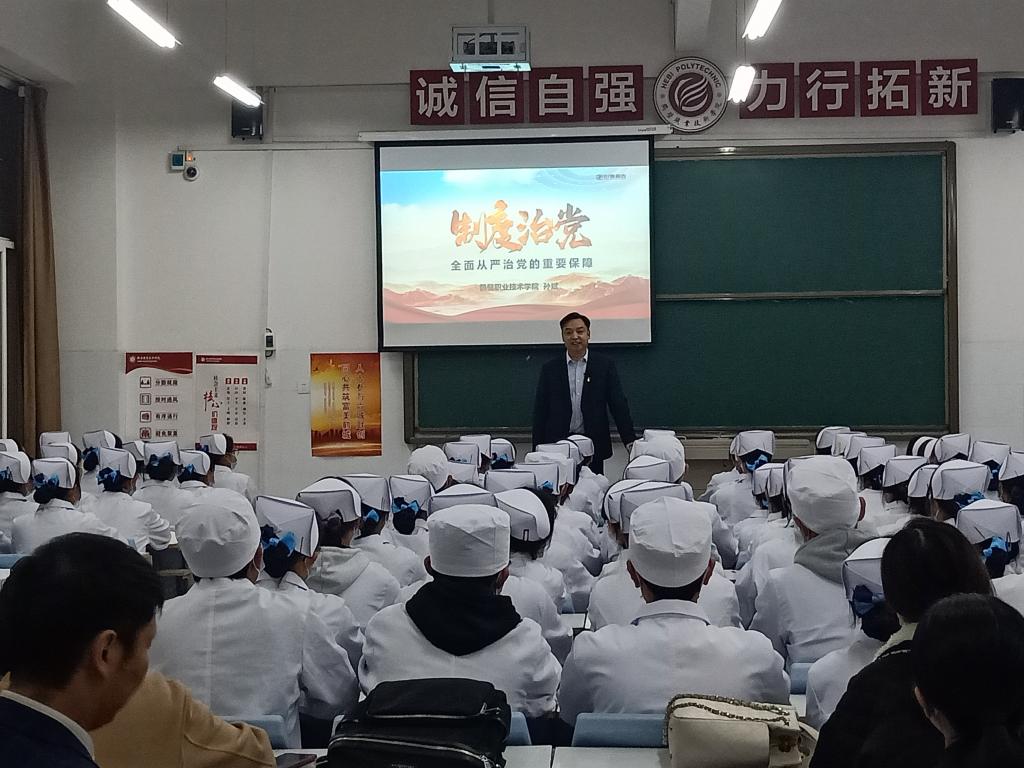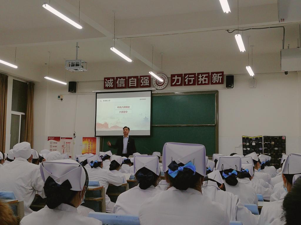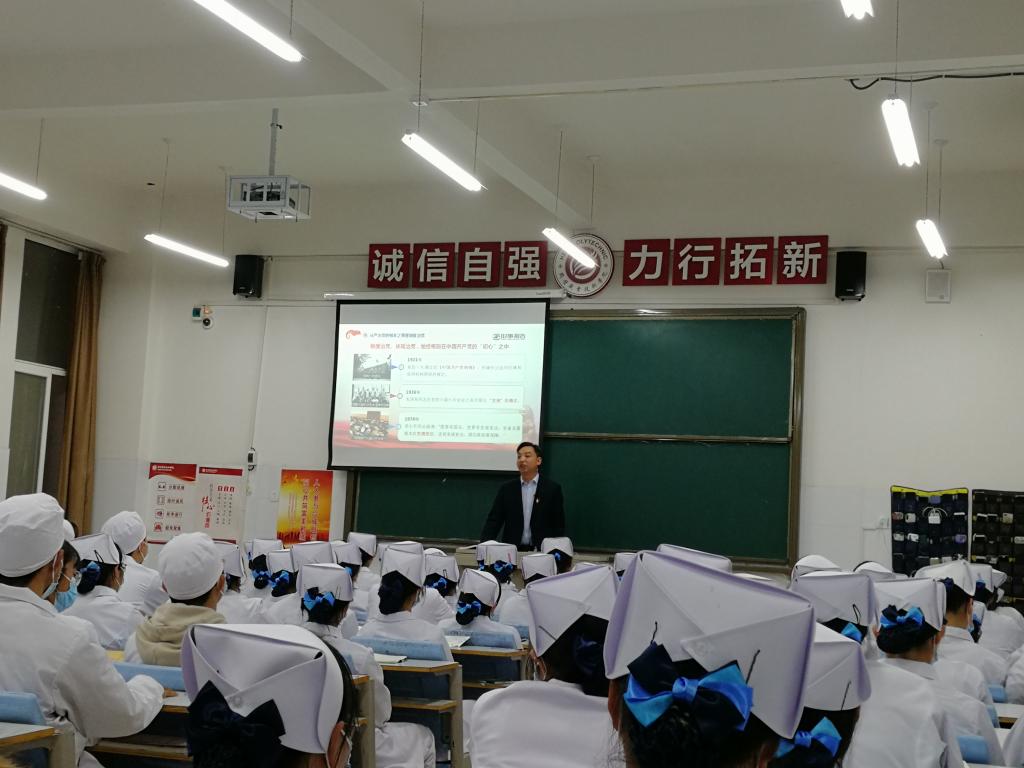 11月18日,党委书记孙斌结合党的建设情况,以《制度治党---全面从严治党的重要保障》为主题,通过列举现实案例、讲述党建故事,为2020级护理专业员工讲授了一堂深刻而生动的《形势与政策》课。